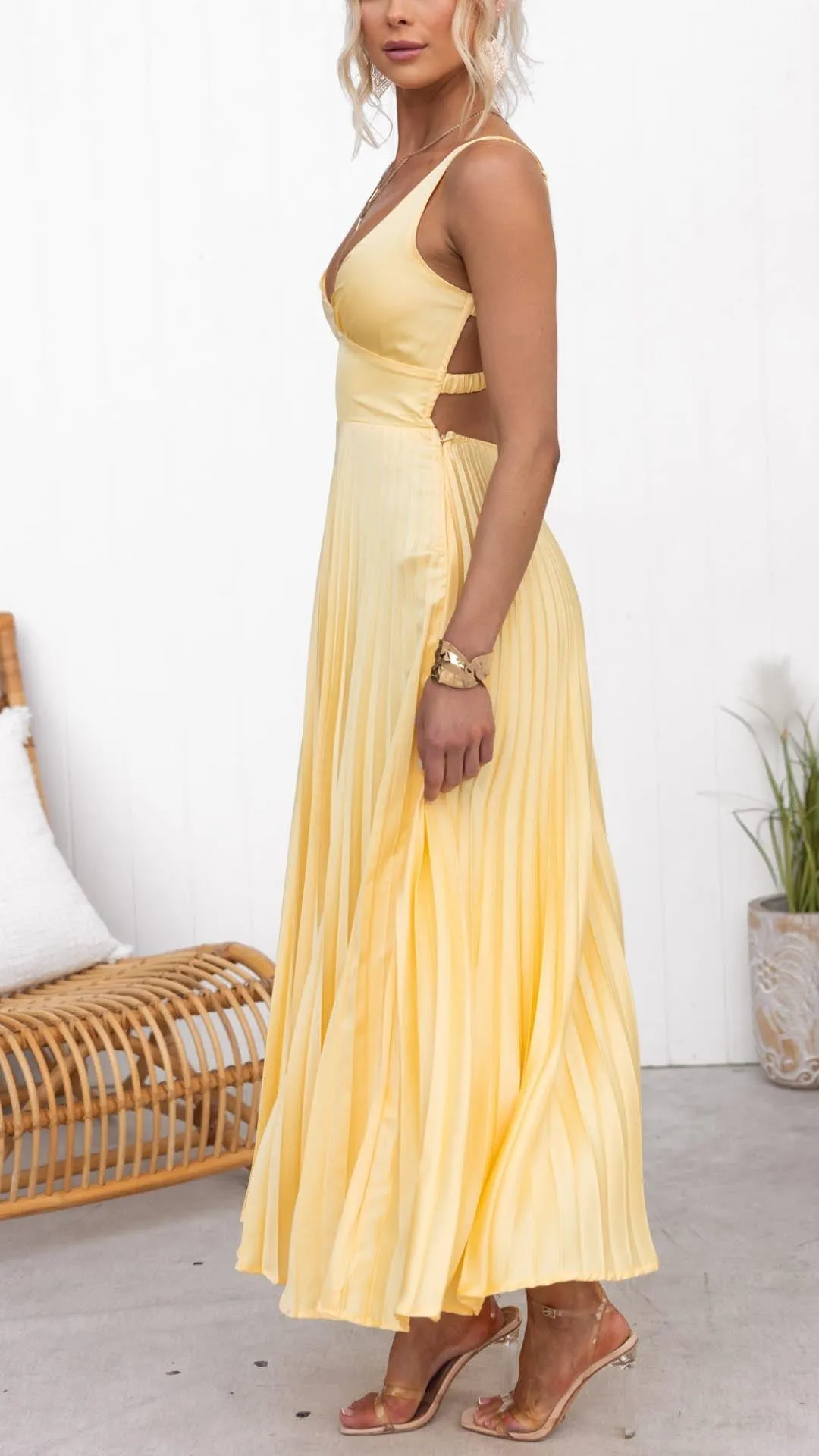 L’Aby – Robe longue plissée jaune à col en V est ton alliée parfaite pour les journées ensoleillées et les douces soirées d’été. Son tissu léger et fluide épouse délicatement la silhouette et assure une allure élégante à chaque pas.