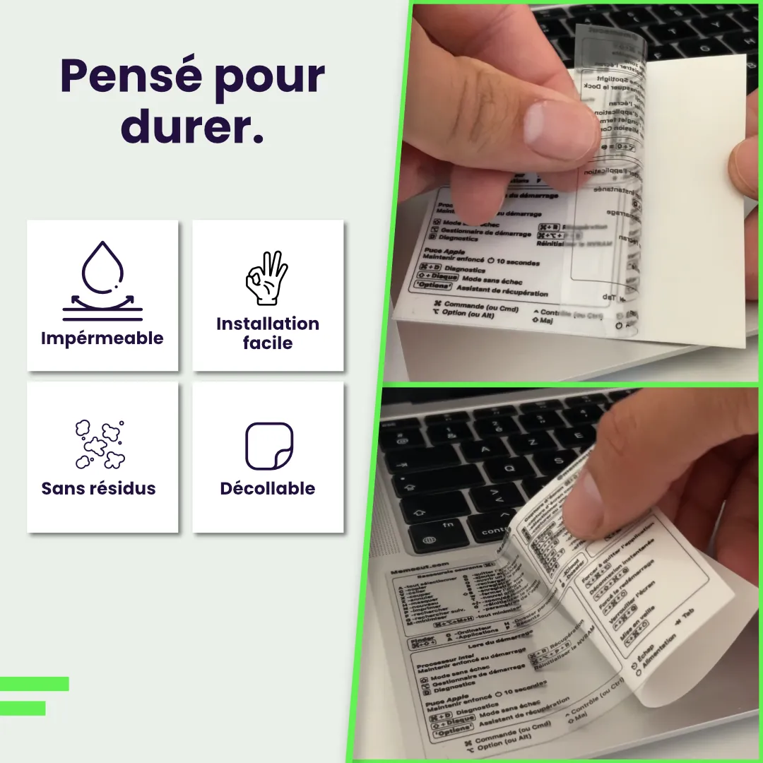 Facile à appliquer sur votre MacBook ou clavier externe Apple, ce sticker discret ne gêne pas la frappe et reste parfaitement lisible. Conçu en français, il affiche une sélection claire et complète de raccourcis utiles pour les logiciels et fonctions système les plus courants. Une aide visuelle pratique au quotidien.