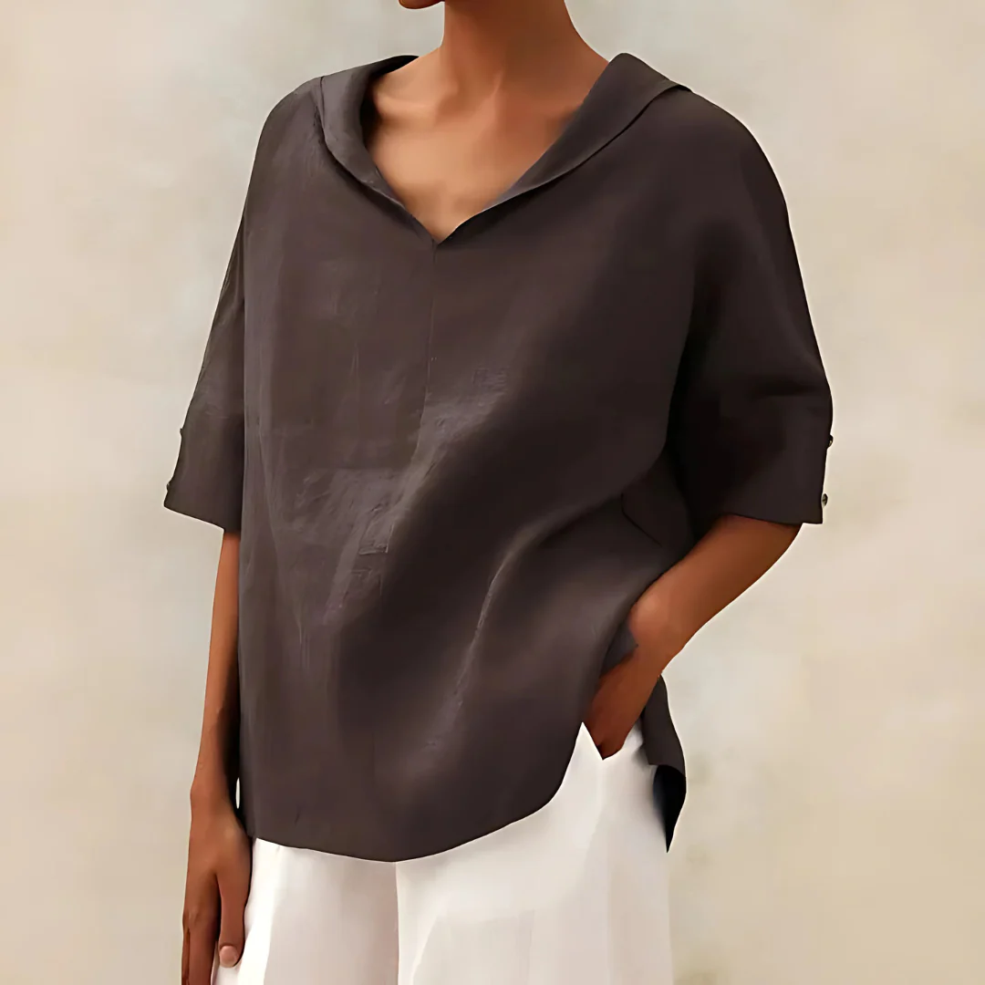 La blouse légère incarne la sobriété élégante grâce à son encolure en V et ses lignes fluides. Son design minimaliste s’adapte à toutes les occasions, du rendez-vous professionnel aux promenades décontractées en ville. Inspirée par les tendances actuelles, cette blouse se marie facilement avec un pantalon structuré ou un jean délavé pour un style raffiné.