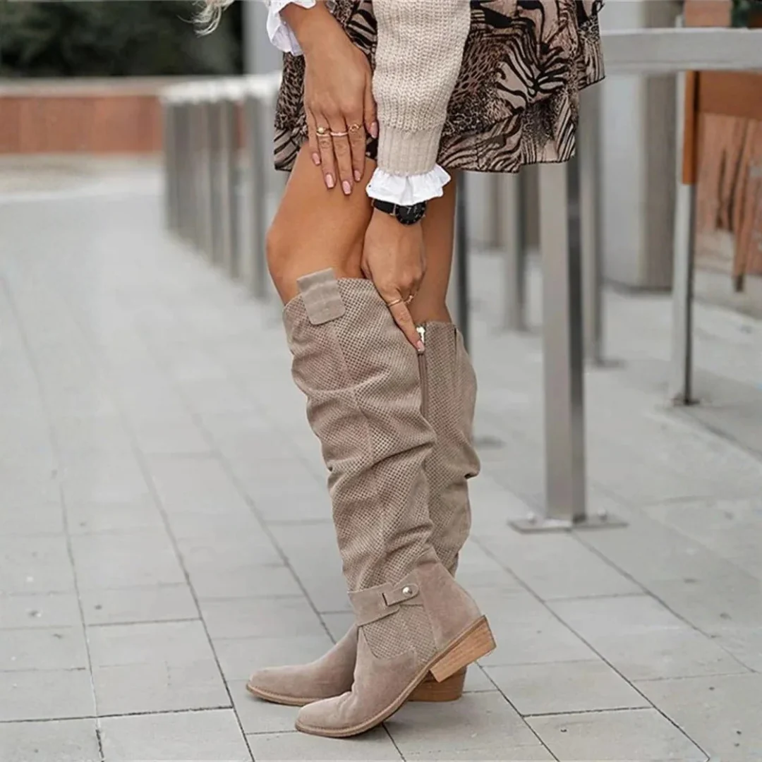 Ces bottes hauteur genou offrent un look élégant qui met avantageusement les jambes en valeur et apporte une touche chic au quotidien. Le design plissé raffiné crée une largeur harmonieuse – idéal avec une jupe, une robe ou un jean slim. Leur couleur discrète se combine facilement et apporte une élégance naturellement stylée.