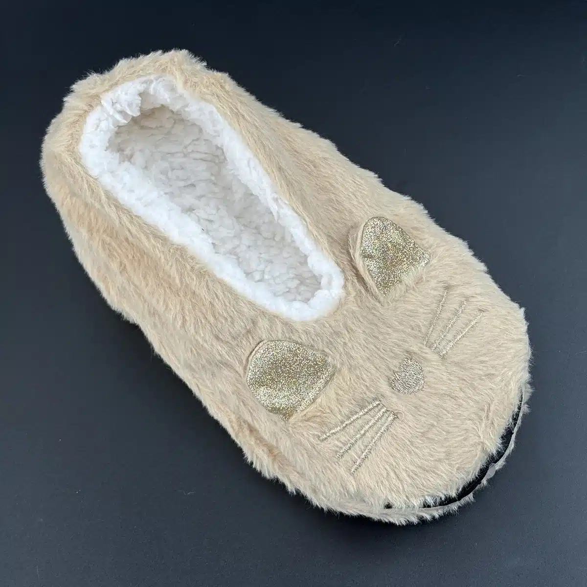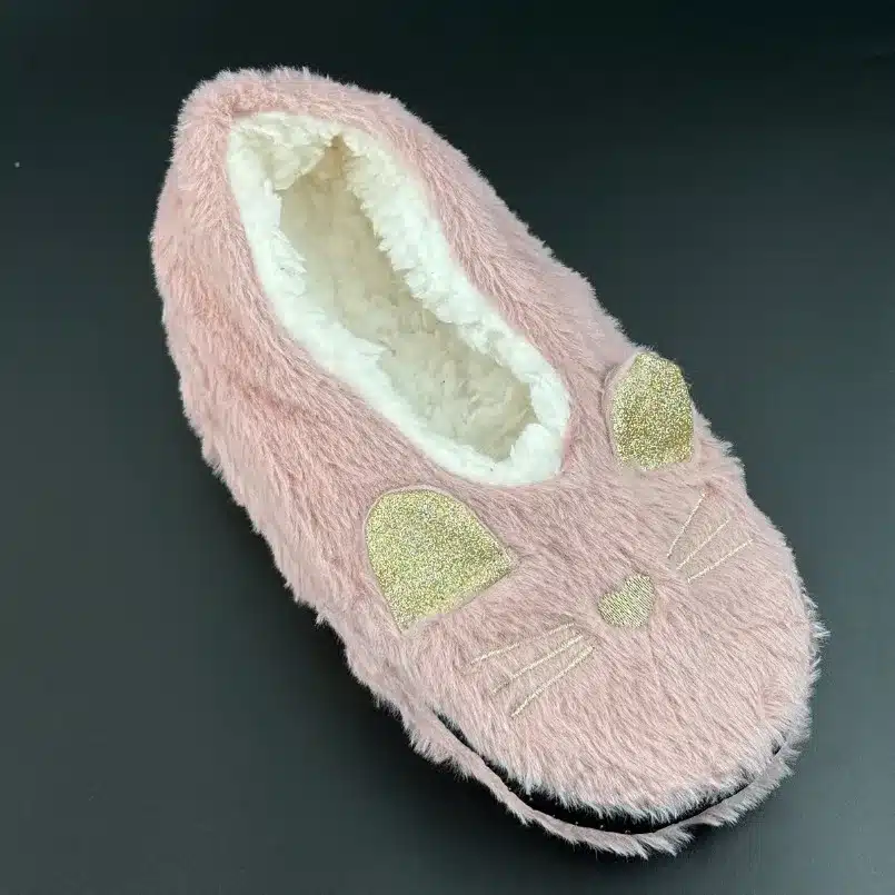 Forme ballerine pratique et facile à enfiler. Peluche douce avec oreilles dorées et moustaches brodées. Doublure moelleuse pour chaleur et confort quotidien.