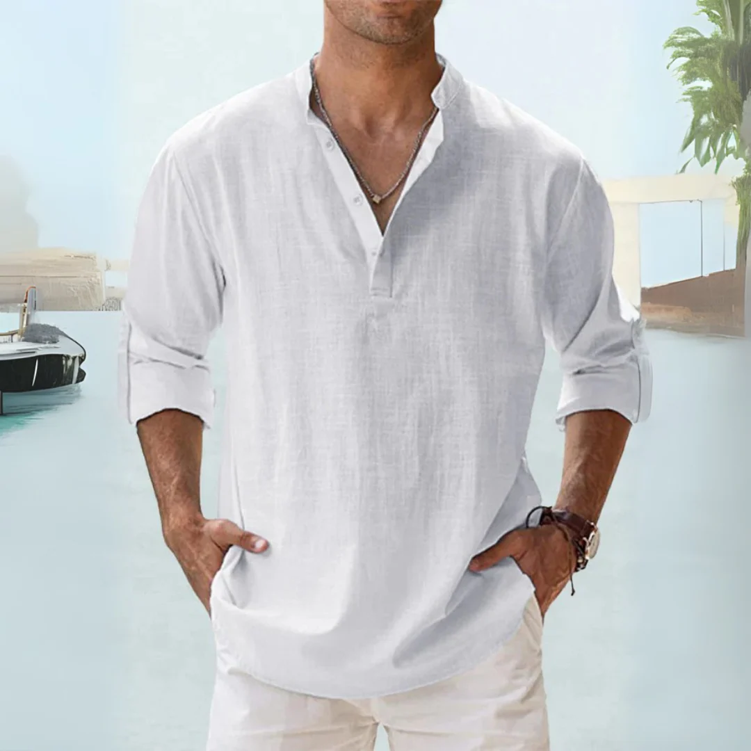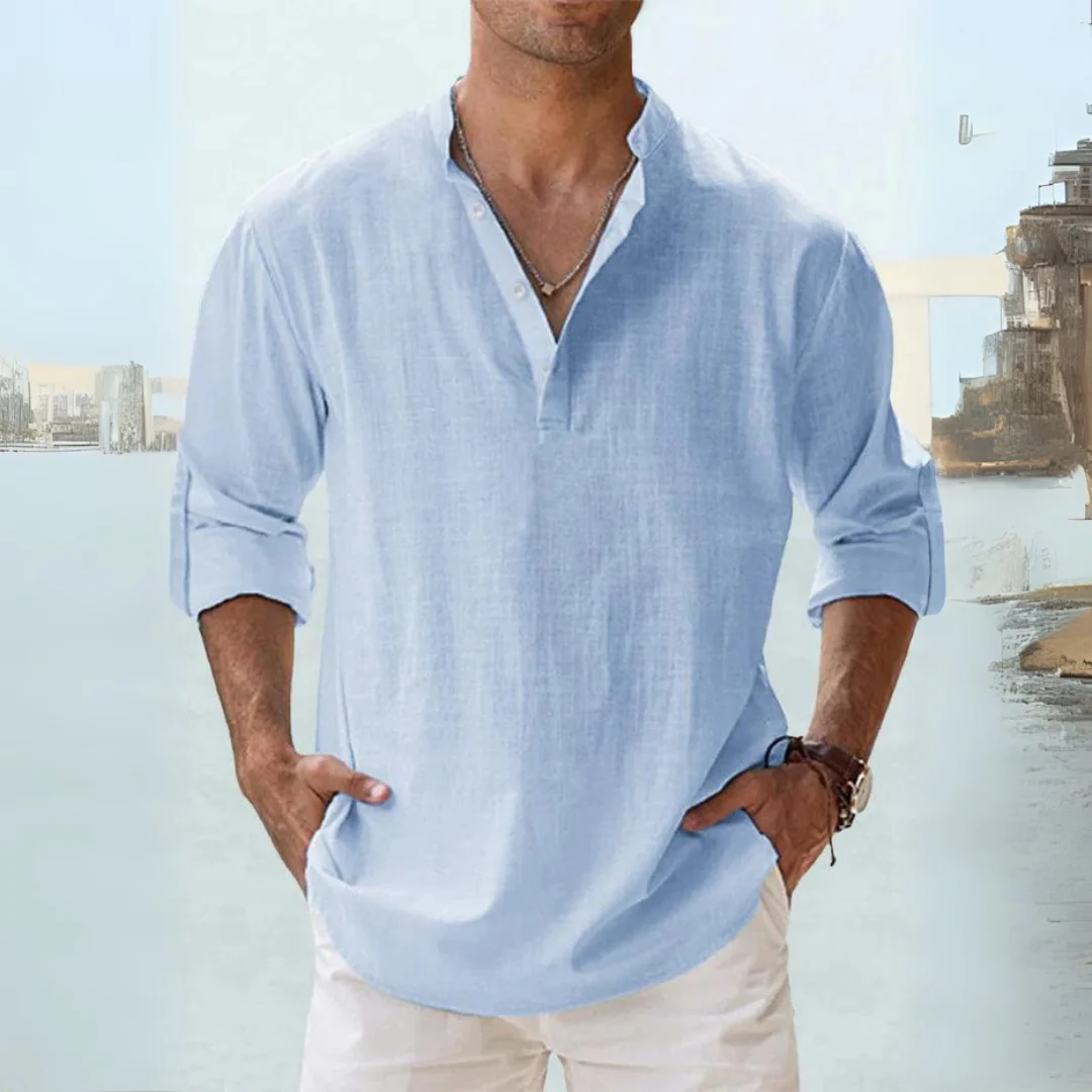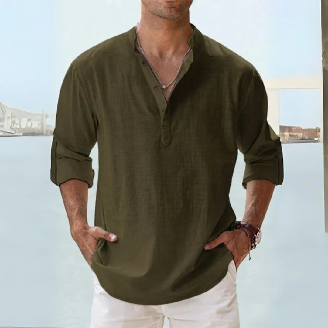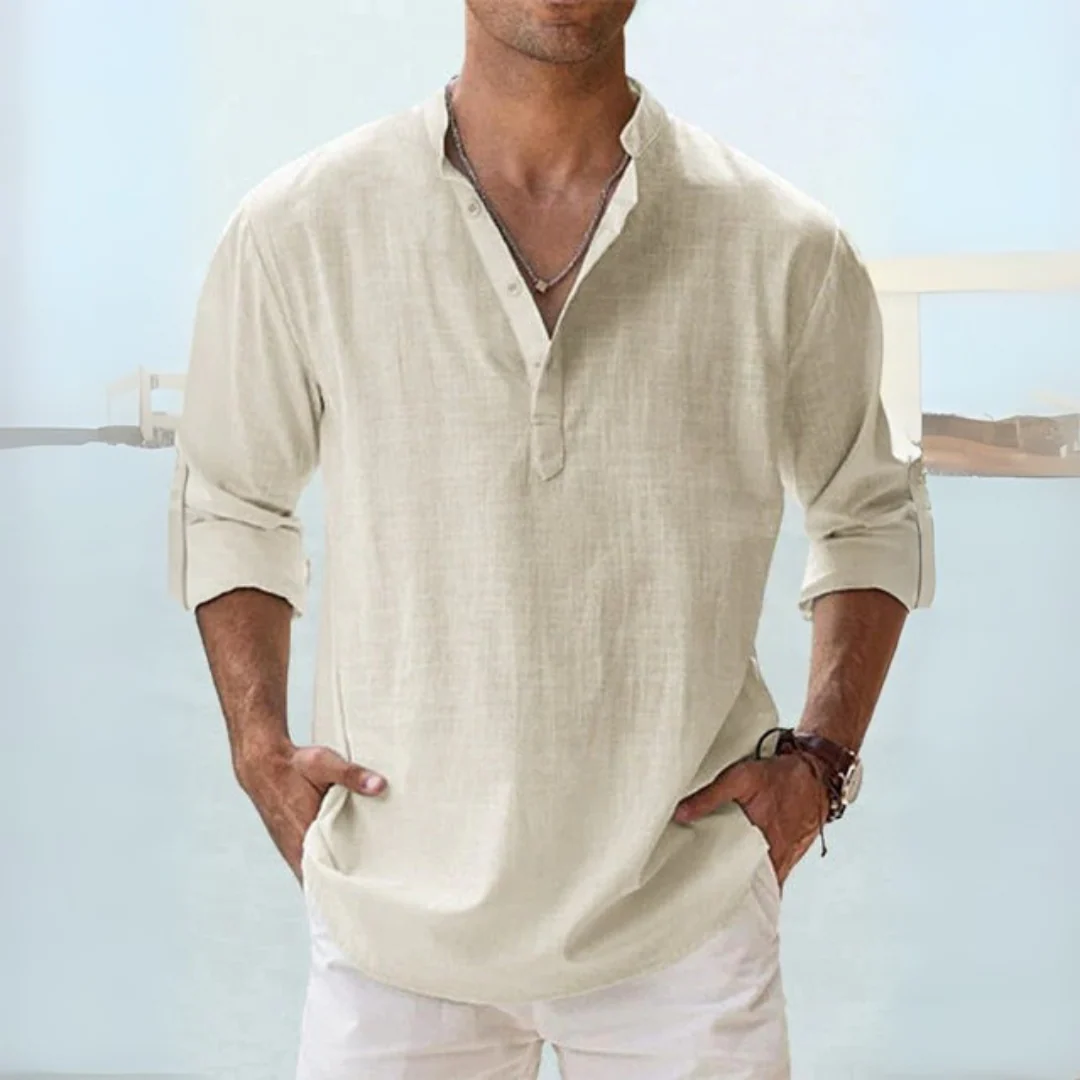 Cette chemise légère en lin est un indispensable pour les journées ensoleillées. Son col fendu sans boutons et sa coupe fluide offrent un style soigné tout en restant confortable. Parfait pour une tenue chic sans effort – à porter aussi bien avec un pantalon élégant qu’avec un short décontracté.