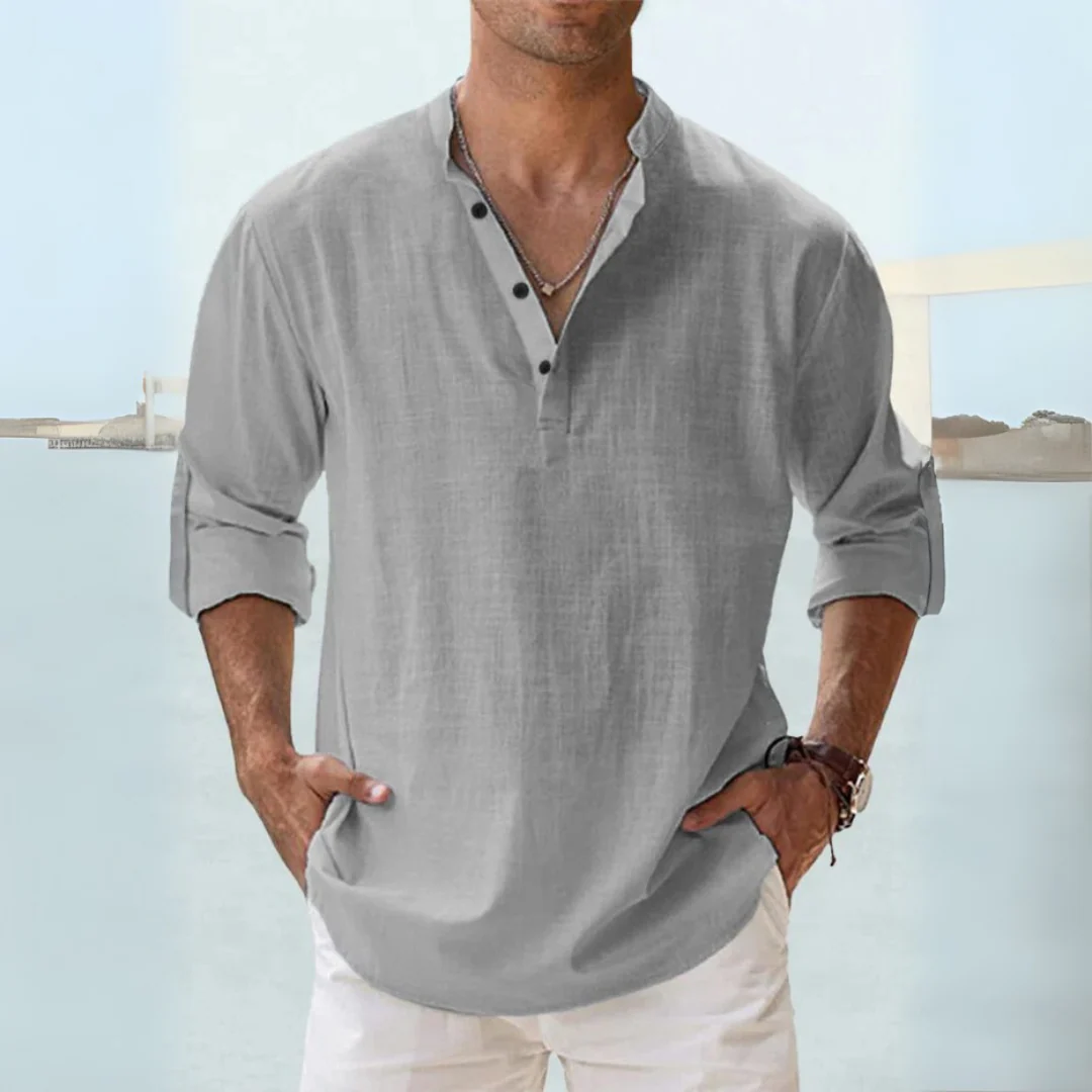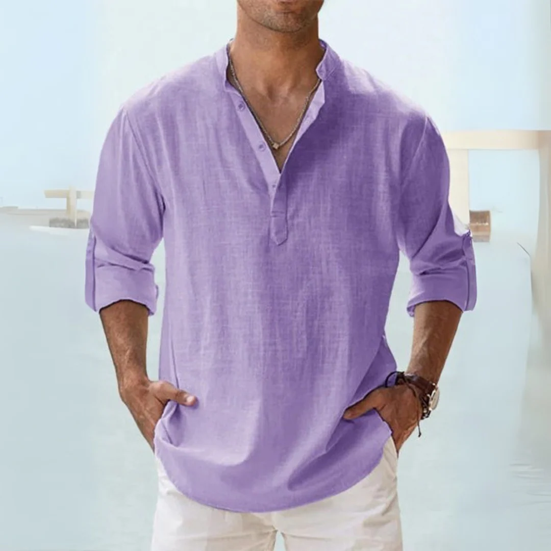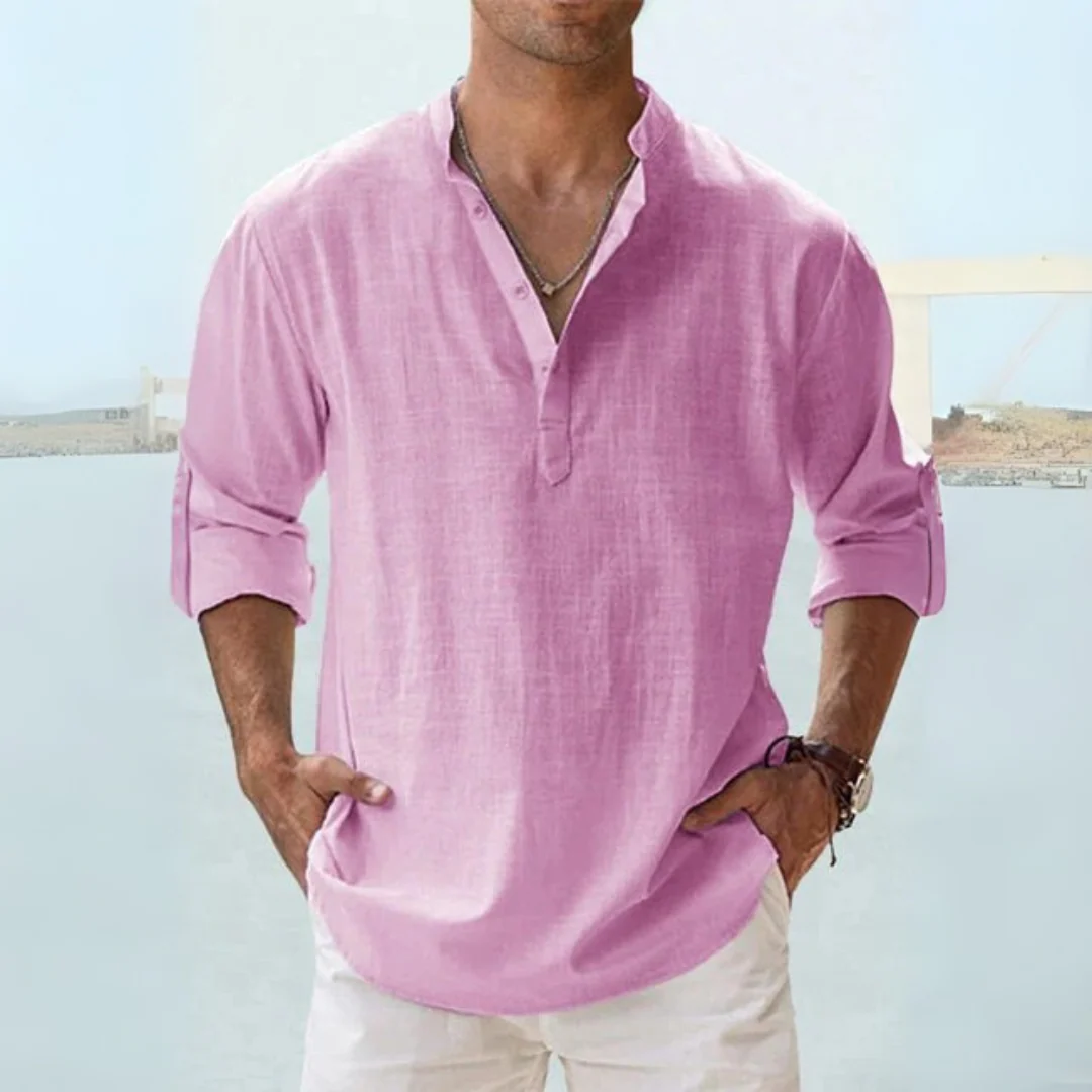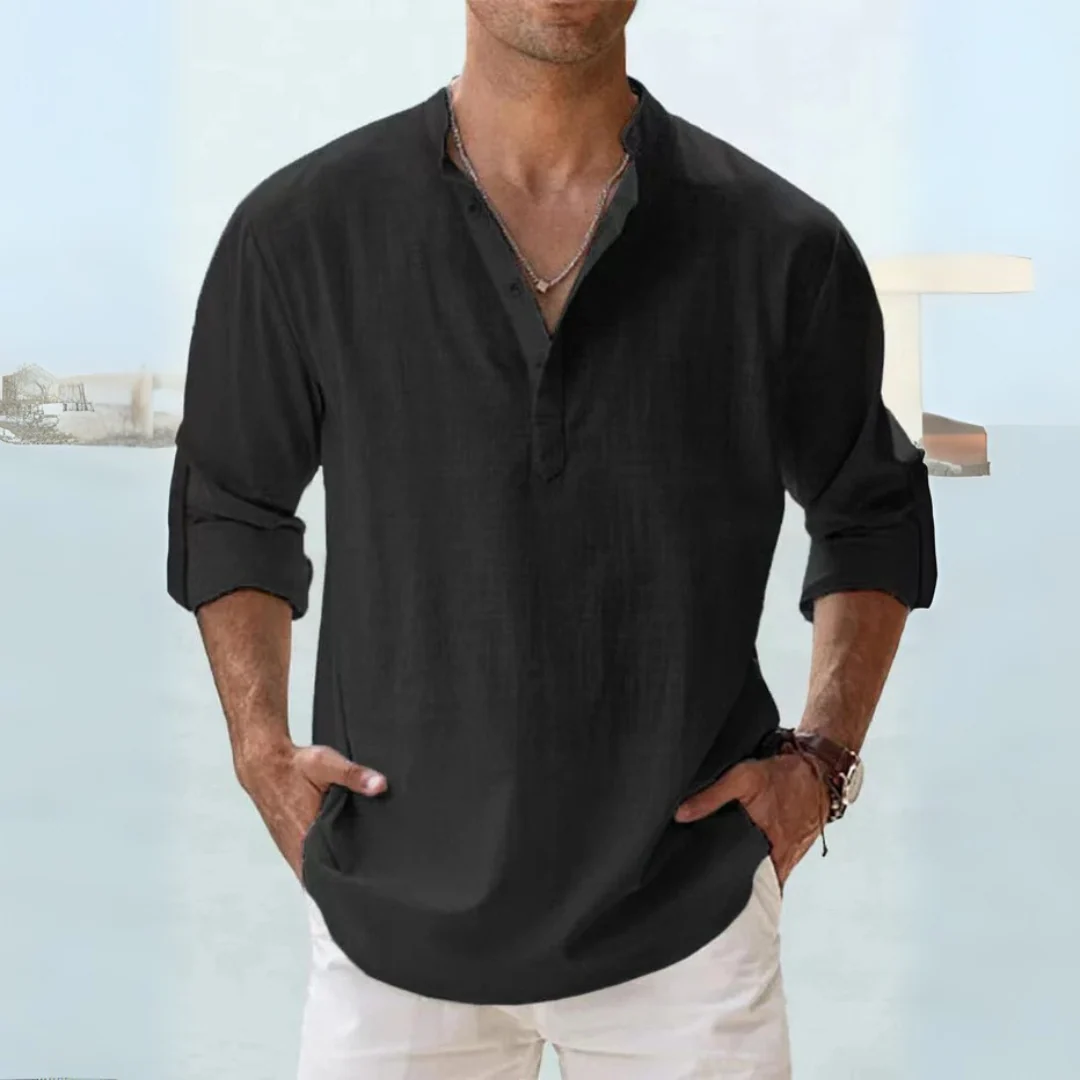 Cette chemise légère en lin est un indispensable pour les journées ensoleillées. Son col fendu sans boutons et sa coupe fluide offrent un style soigné tout en restant confortable. Parfait pour une tenue chic sans effort – à porter aussi bien avec un pantalon élégant qu’avec un short décontracté.