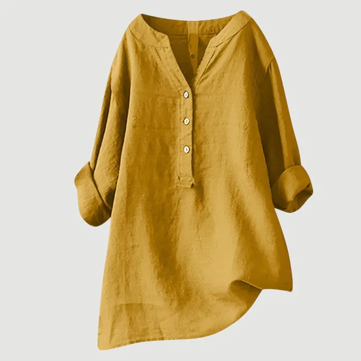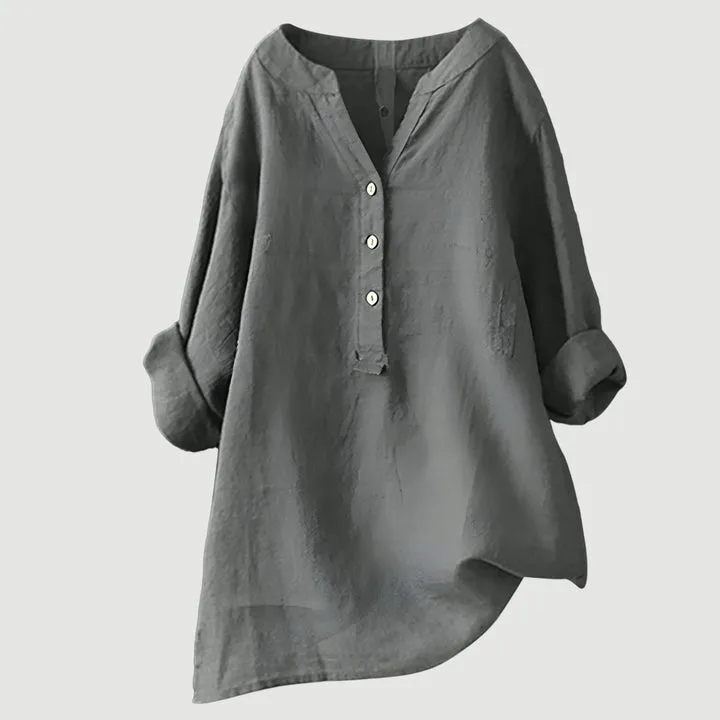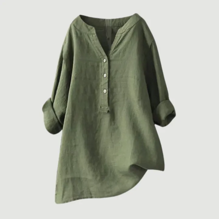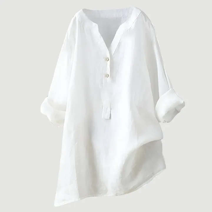 Cette chemise légère en lin procure une sensation agréable sur la peau – même pendant les journées les plus chaudes. Le col en V avec patte de boutonnage associe élégance et fonctionnalité au quotidien. La coupe large tombe souplement sur les hanches et garantit une silhouette flatteuse.