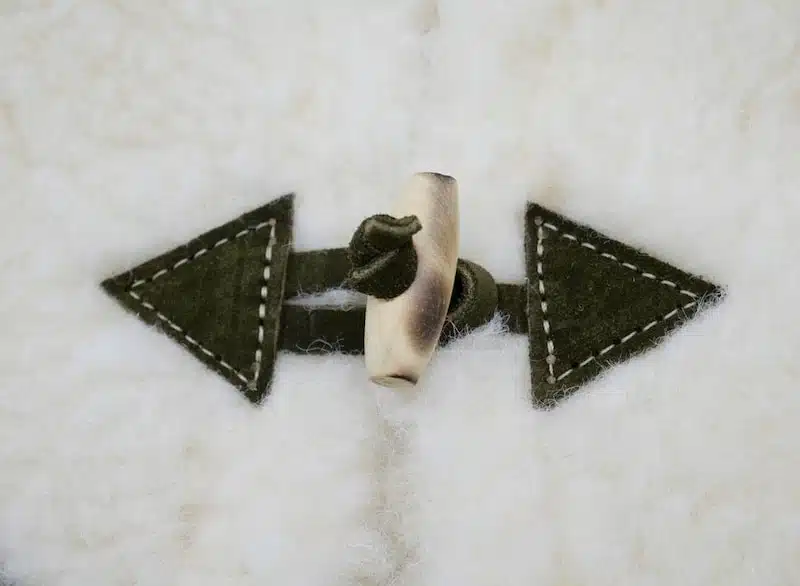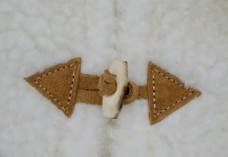 Il se ferme avec un ou deux boutons en bois (variable en fonction de la taille).