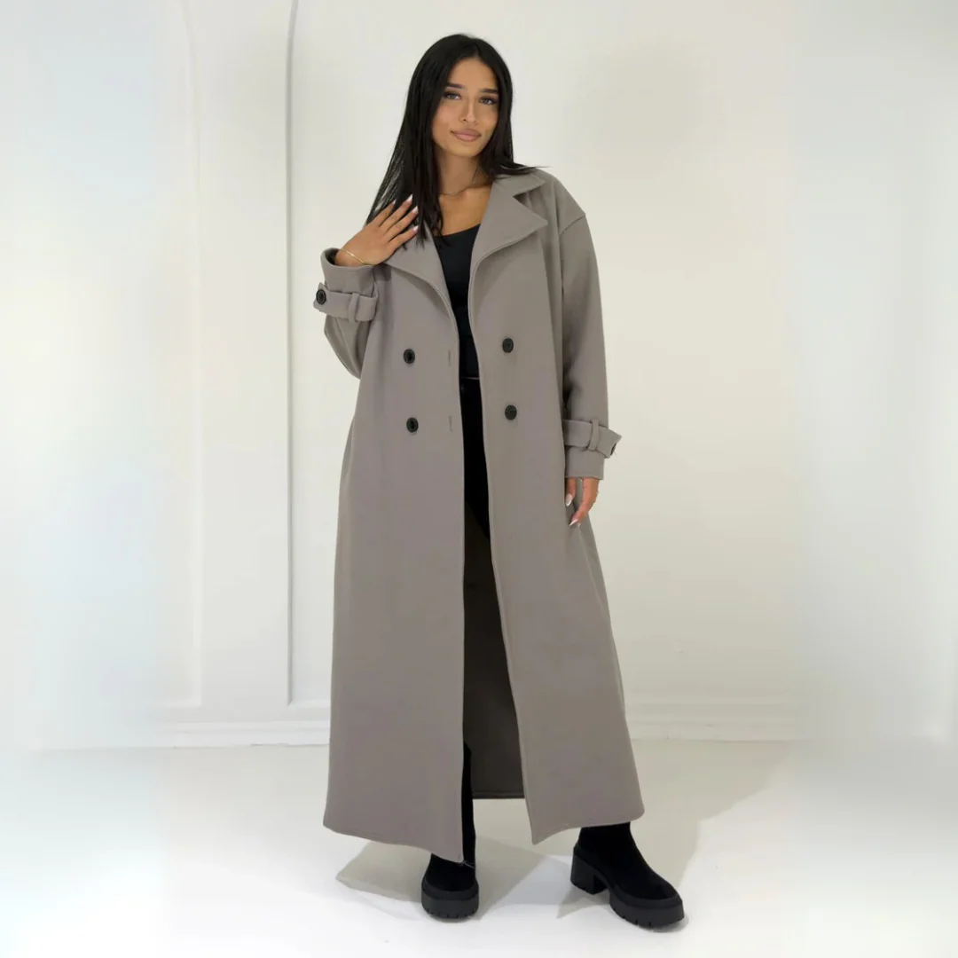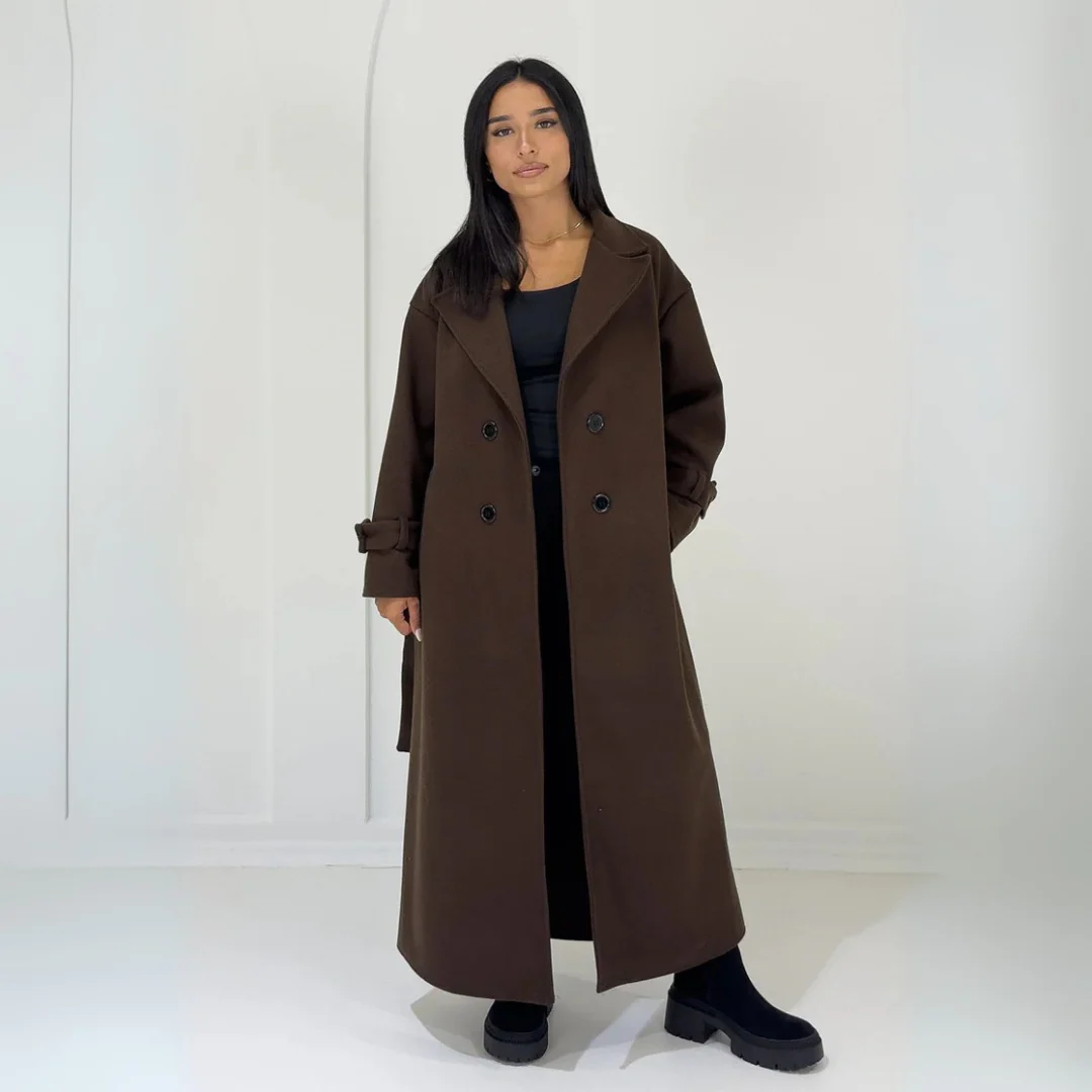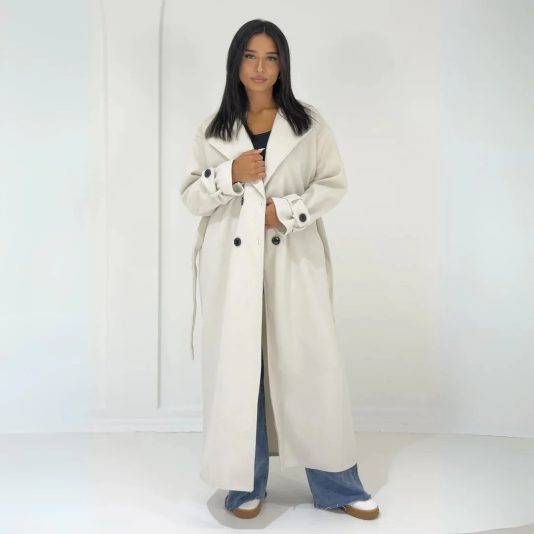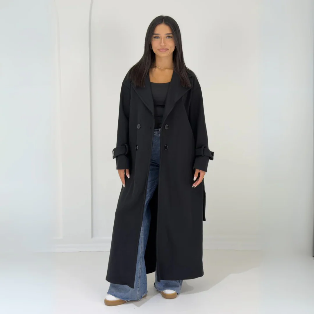 Ce long manteau séduit par son élégance épurée et ses lignes nettes. Sa coupe décontractée en fait un compagnon polyvalent pour le bureau, les loisirs ou les événements en soirée.
