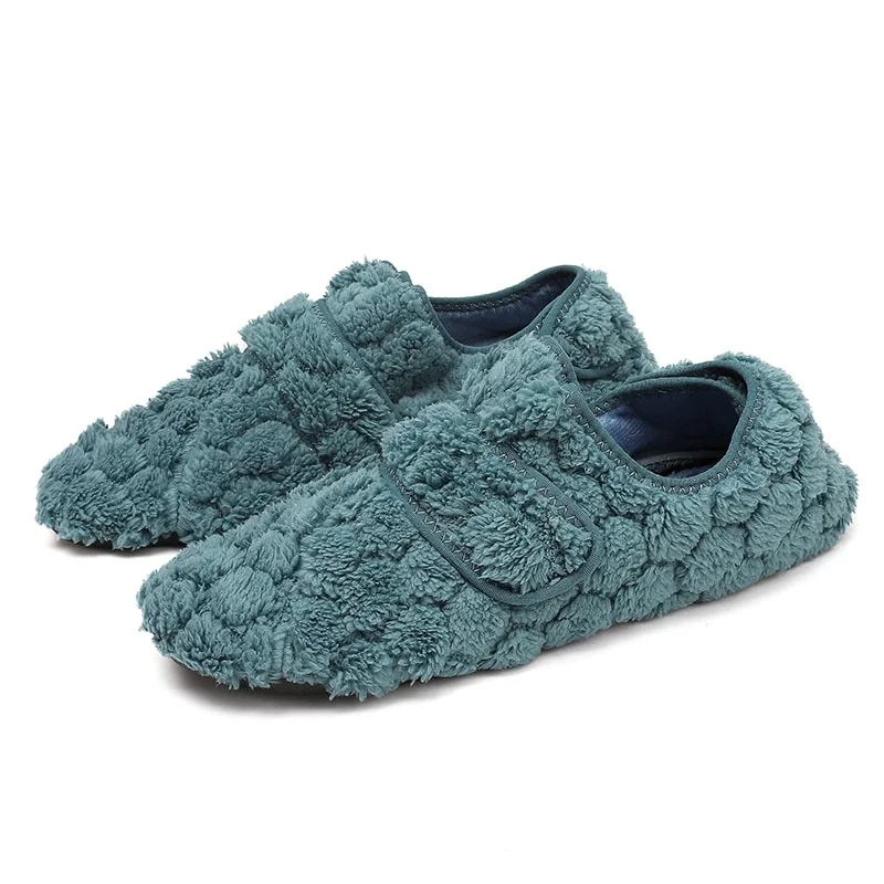 Ces pantoufles anti-chute personne âgée sont en coton avec une matière pelucheuse en relief qui crée un effet nuage doux et moelleux autour du pied.