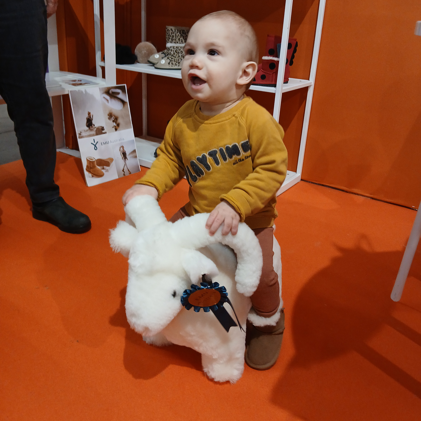Peluche de décoration adorable en laine Mérinos Emu Australia, au motif du mouton emblématique de la marque.