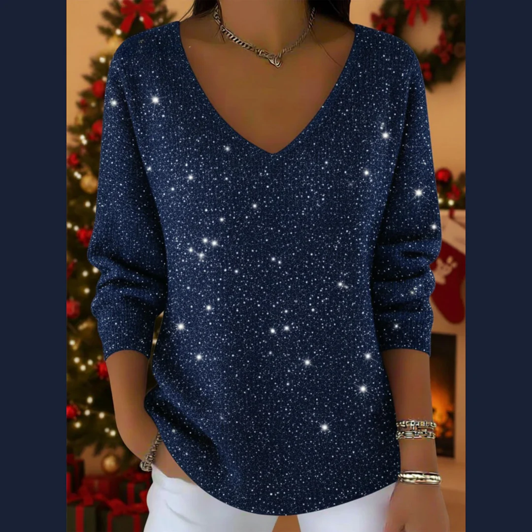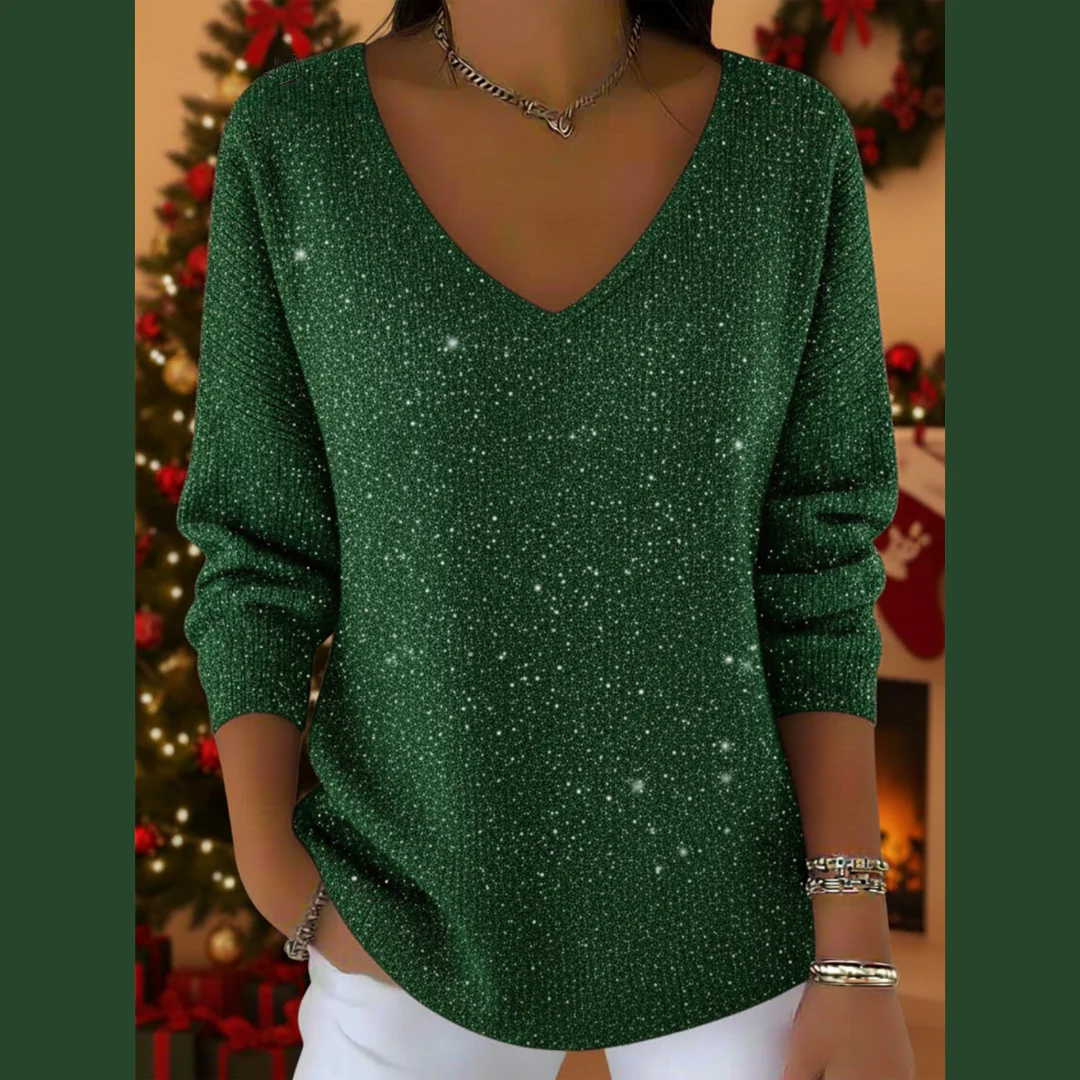 Apportez une touche de lumière à votre hiver avec ce pull à col V festif. Sa maille légèrement scintillante, son col en V flatteur et sa coupe fluide créent une allure féminine, élégante et confortable – idéale pour les moments festifs comme pour les journées plus calmes.