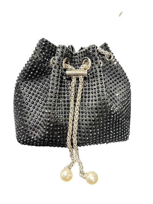 Ce sac à main pour femme est un modèle seau élégant et scintillant, entièrement orné de strass noirs pour un effet glamour et raffiné.Son format compact et sa chaîne dorée lui confèrent une allure chic, parfaite pour accompagner vos tenues de soirée, d’événements ou de sorties habillées.Le design mêle modernité et sophistication, en jouant sur la brillance des strass et la finesse des détails dorés. Intérieur : doublure textile noire, compartiment principal unique suffisamment spacieux pour accueillir les essentiels (téléphone, portefeuille, clés, rouge à lèvres, etc.) Dimensions approximatives : hauteur 20 cm x largeur 18 cm x profondeur 10 cm