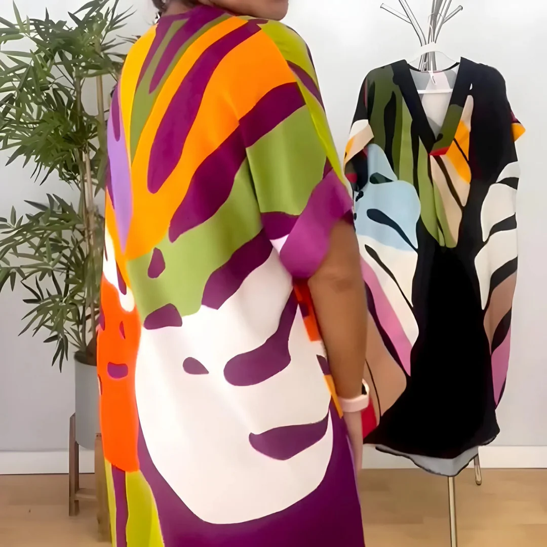 Avec ses lignes fluides et son imprimé audacieux, cette robe légère insuffle une touche artistique à chacun de vos mouvements. Sa coupe ample suit les courbes naturellement tout en offrant une grande liberté de mouvement. Idéale pour les journées ensoleillées, elle procure une sensation de légèreté très agréable dès que vous l’enfilez.