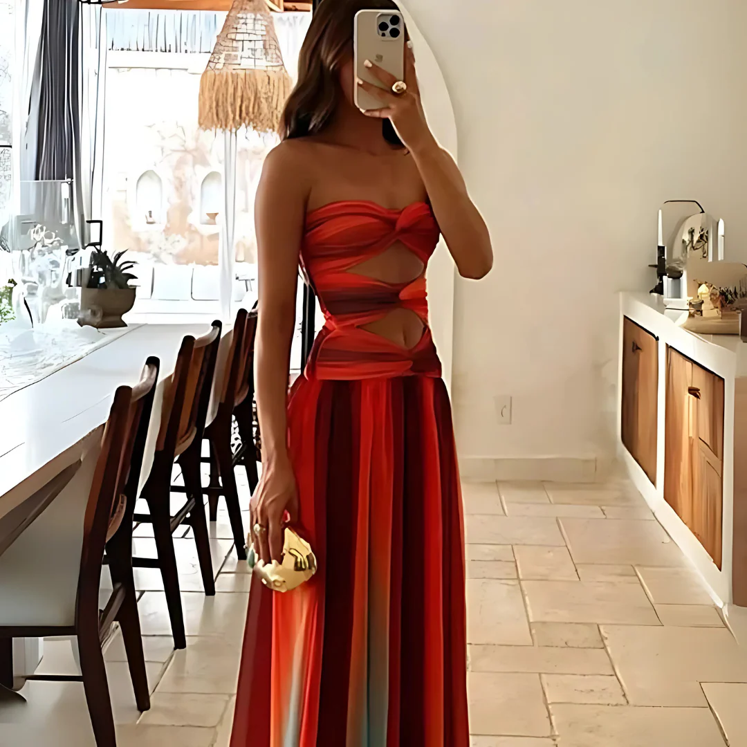 La robe se distingue par un effet drapé flatteur au niveau de l’abdomen, un dos partiellement nu et une découpe sensuelle à la taille. Chaque couture met en valeur la silhouette avec audace et féminité. Disponible dans des tailles du XS au 3XL, elle s’adapte à toutes les morphologies pour un rendu aussi séduisant que confortable.