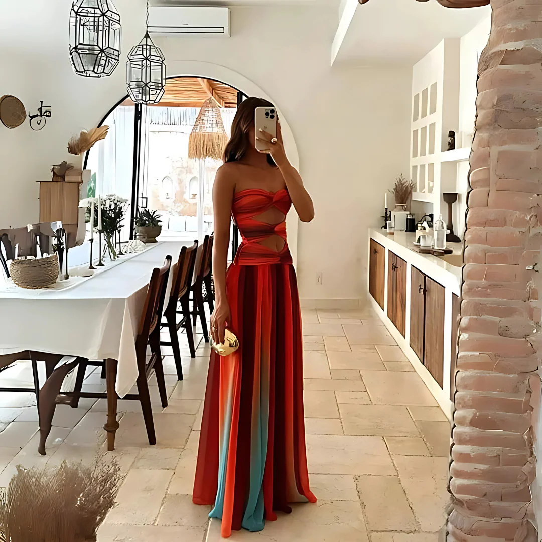 Sublimez vos courbes avec cette robe longue satinée à la coupe sculptante. Son décolleté ajusté avec détails dorés met élégamment en valeur la poitrine, tandis que sa fente latérale dévoile subtilement la jambe. Le tissu brillant capte la lumière pour un effet wahou immédiat, parfait pour vos soirées d’été, cocktails ou événements glamour.
