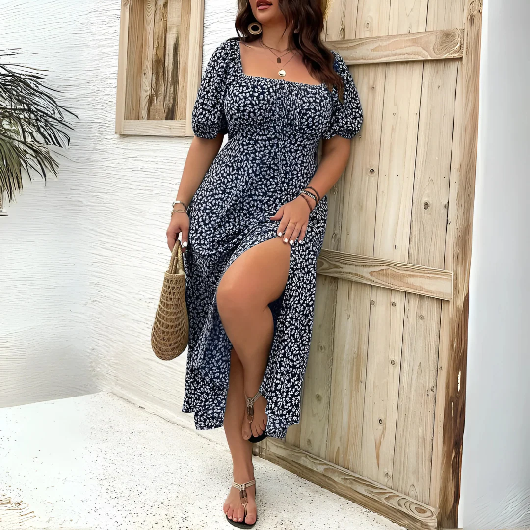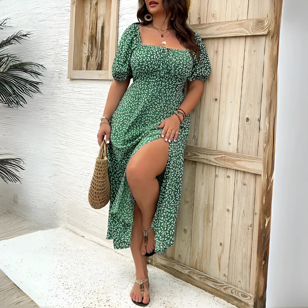 Cette robe longue au doux imprimé incarne un style à la fois romantique et décontracté. Sa coupe fluide met en valeur la silhouette tout en offrant une grande liberté de mouvement. Le décolleté carré et les manches bouffantes ajoutent une touche vintage qui est totalement dans l’air du temps.