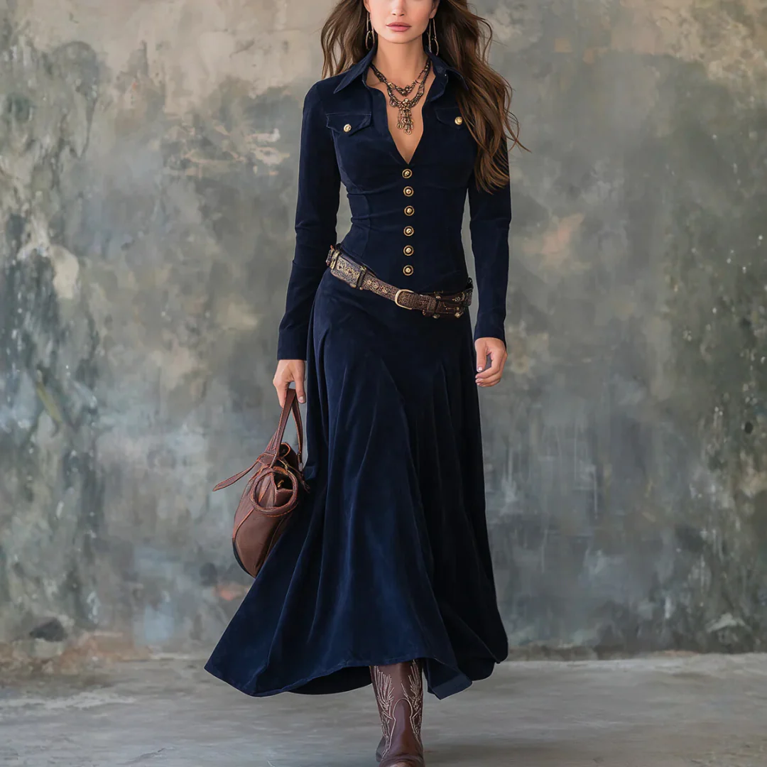 Cette robe longue en suédine sublime les courbes avec une coupe fluide et structurée. Sa matière douce procure un confort immédiat tout en offrant une allure raffinée. Les boutons décoratifs apportent un accent affirmé qui souligne la ligne du buste et crée une touche sophistiquée. Sa coupe met harmonieusement la taille en valeur pour un charme intemporel.