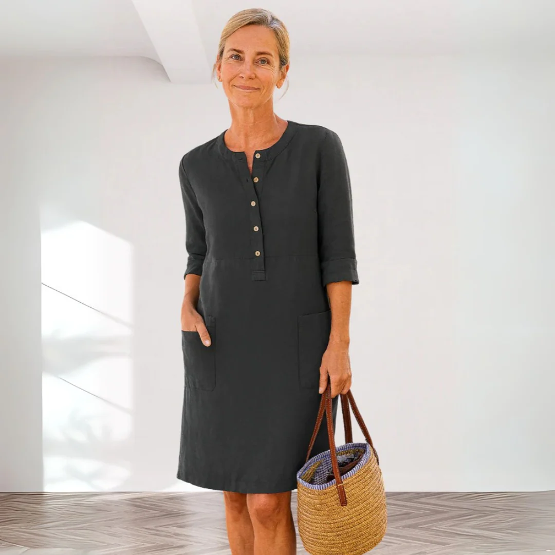 Cette robe unie associe confort et style grâce à sa coupe fluide et son design épuré. Son col boutonné apporte une touche classique qui s’adapte aussi bien aux journées décontractées qu’aux moments plus habillés.