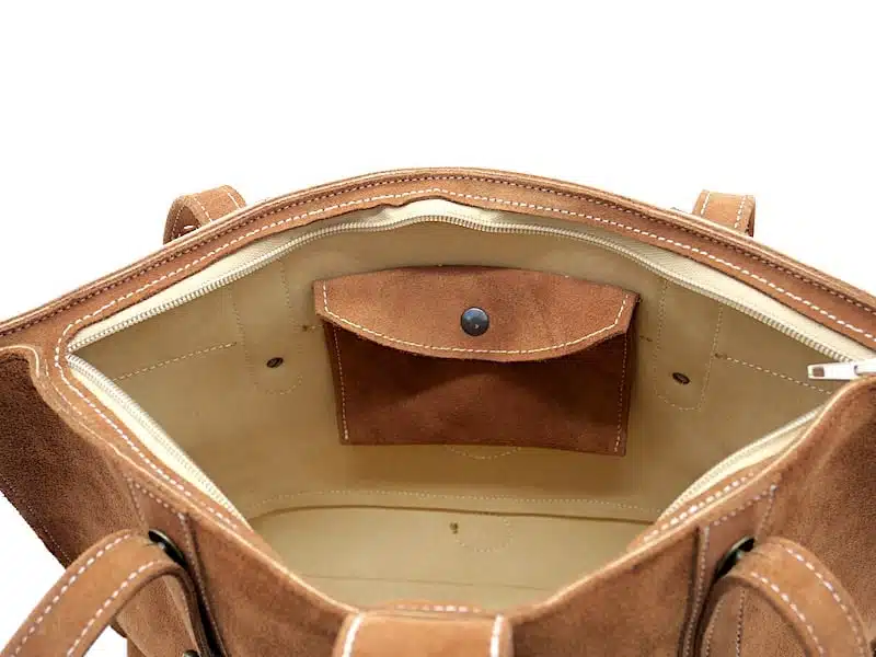 … découvrez un intérieur entièrement doublé de cuir offrant un large espace de rangement pouvant même contenir un ordinateur portable, ainsi qu’une petite pochette très pratique pour vos petits objets comme clés, cartes…